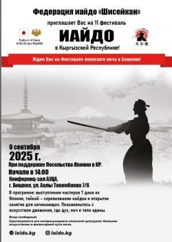 Федерация иайдо «Шисейкан» проводит 11 Фестиваль иайдо в Кыргызстане. Мы приглашаем всех заинтересованных на наш Фестиваль. Для вас подготовлена интересная программа, в том числе выступление мастеров из Японии и турнир среди иайдок.